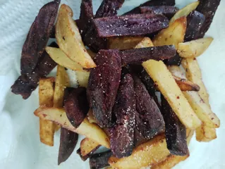 こちらは、あいにくの雨です ちょっぴり肌寒いこんな日は フライドポテトを 揚げたて食べてみませんか?! ■材料・分量・じゃが芋 1個 新じゃが使用・紫さつまいも 約150g (余り物芋🍠消費するため)・たまねぎスープ お好みの量・油 200ml■作り方直径20cmのフライパン使用です下準備