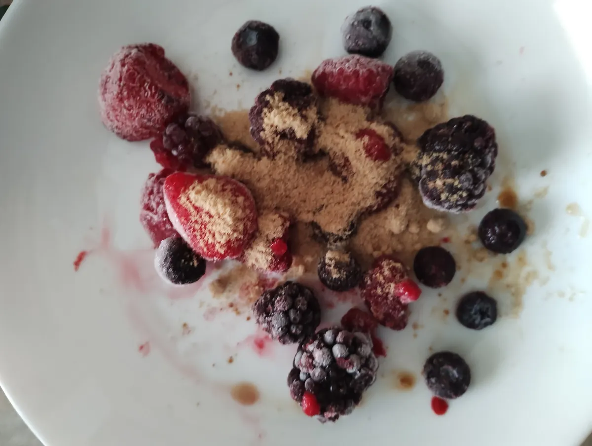 🍁耐熱皿に冷凍フルーツを入れ粉黒糖を混ぜ レンチン1〜2分で写真の様になります