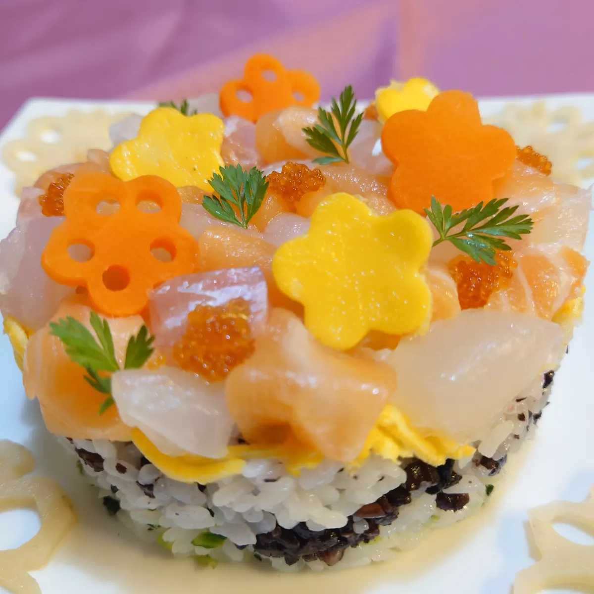 ひなまつりが近いので、ケーキ寿司をつくりました。3層にしましたが、あまりよく分からないかもです💦