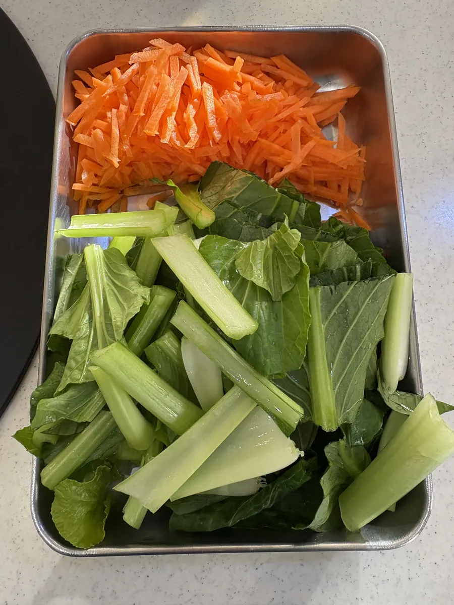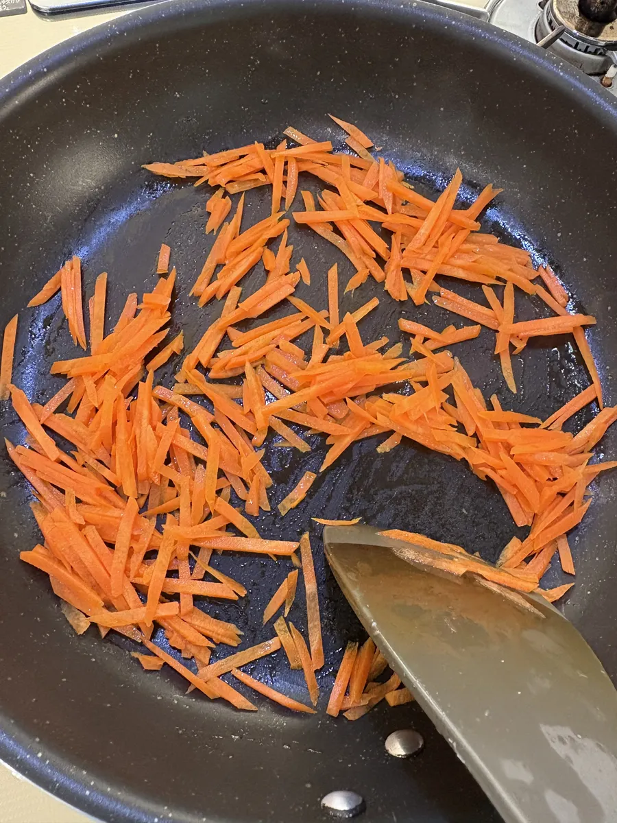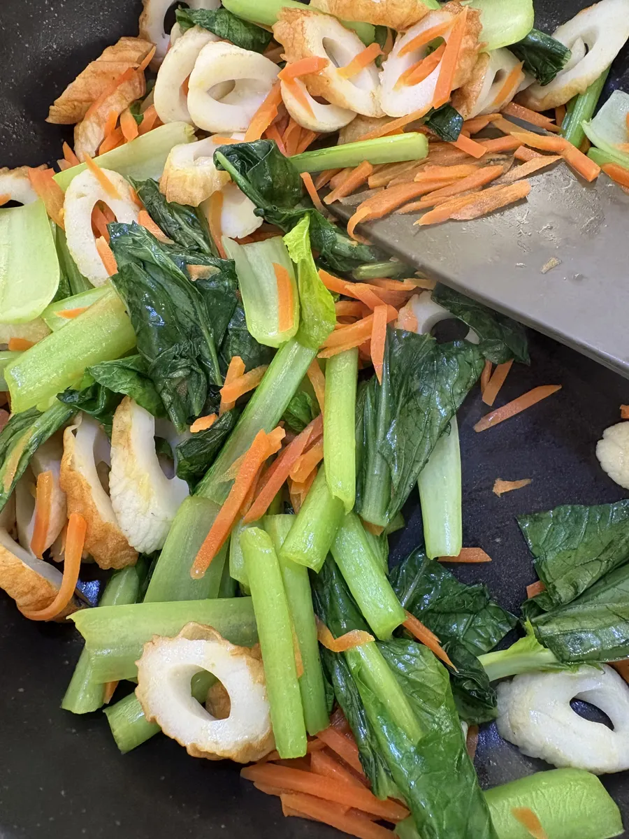人参がしんなりしてきたら 小松菜の軸 次は竹輪 最後に小松菜な葉をいれます