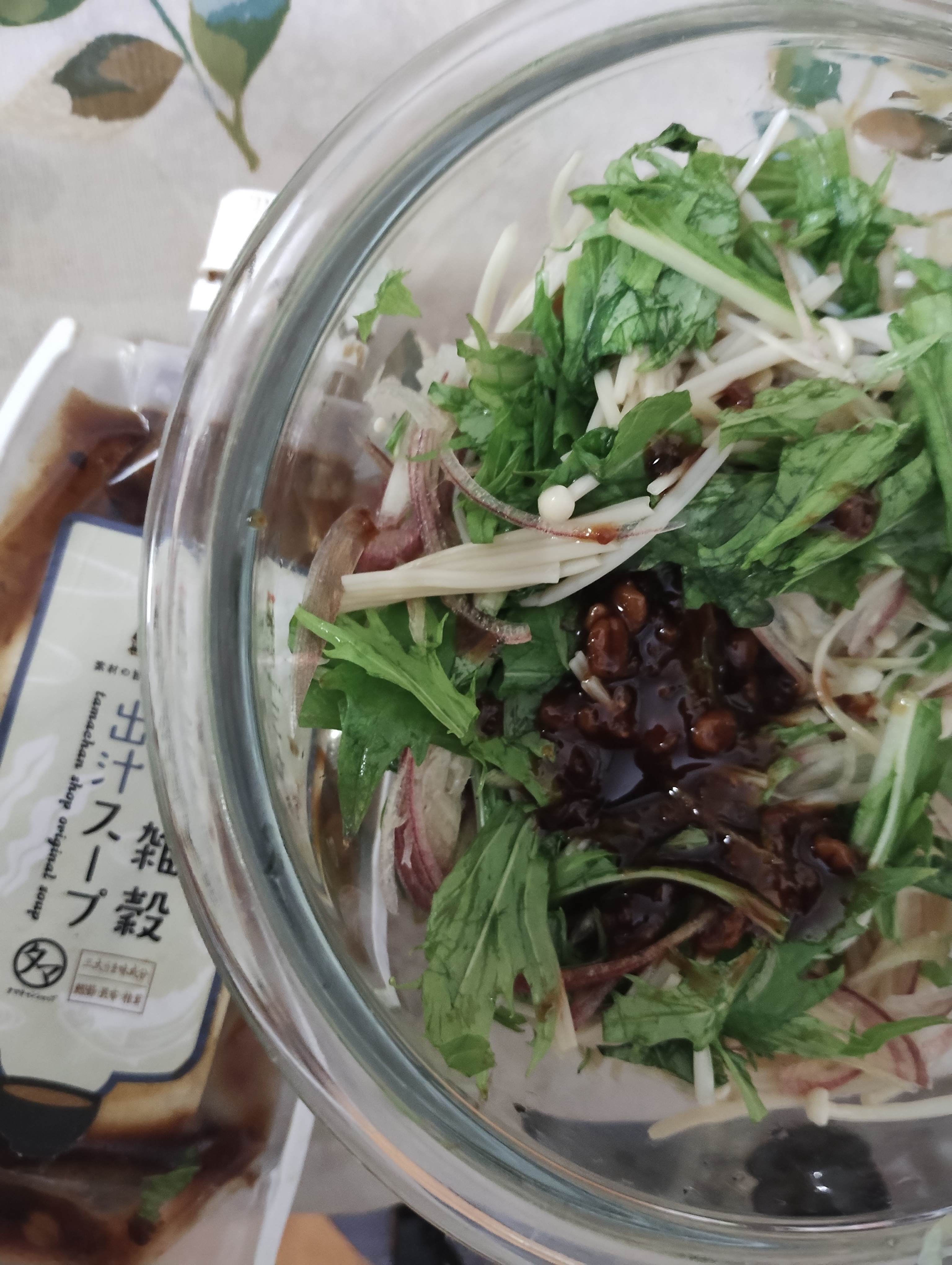 ⑤えのきの熱いうちに 水菜の葉を混ぜて みょうがを混ぜて 三十雑穀出汁スープとボンズを入れて和える