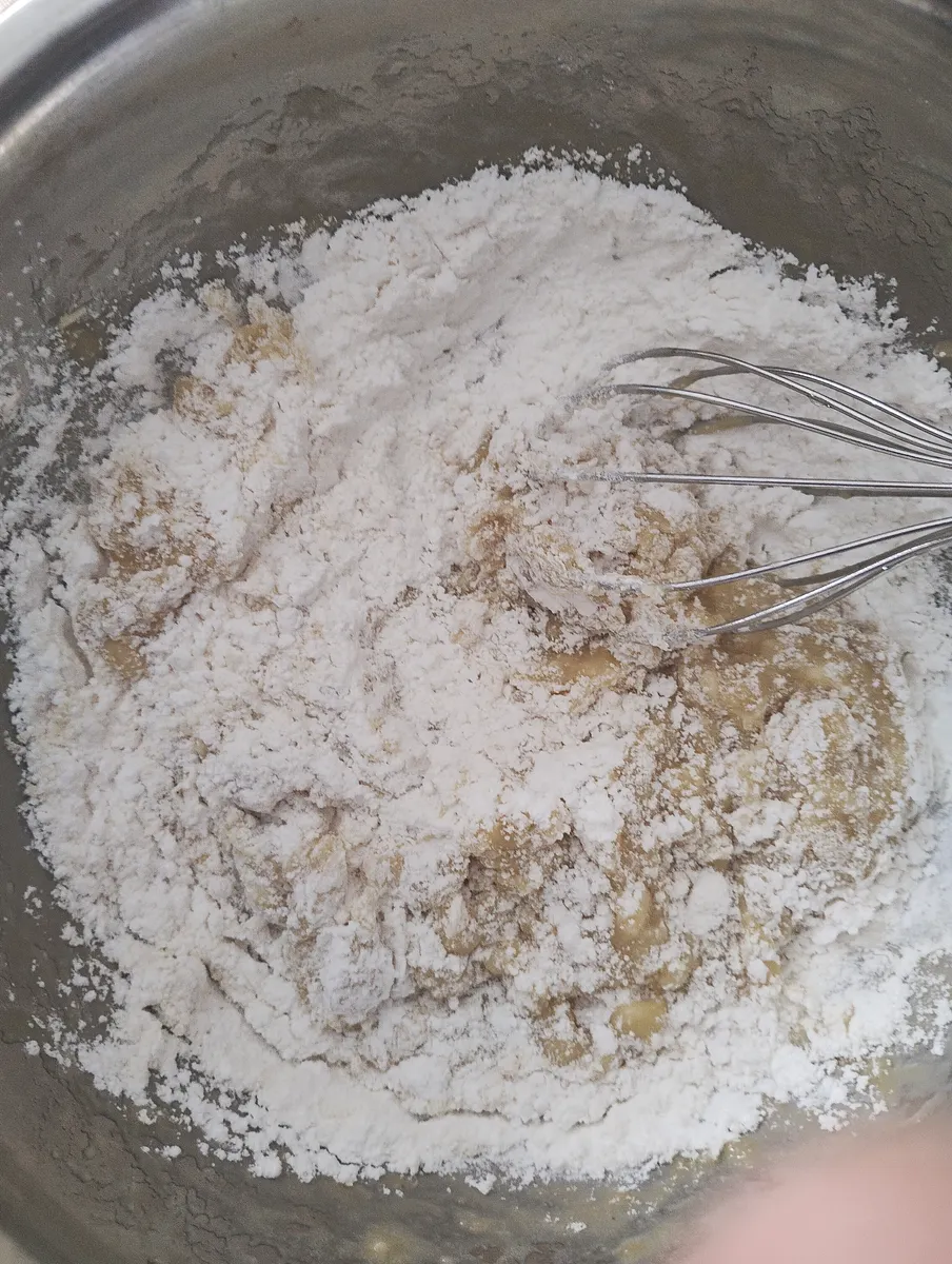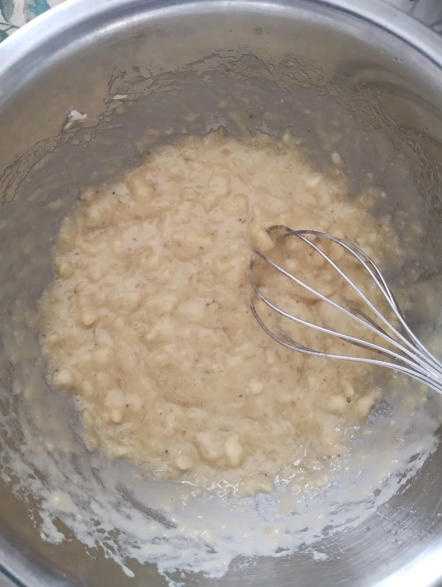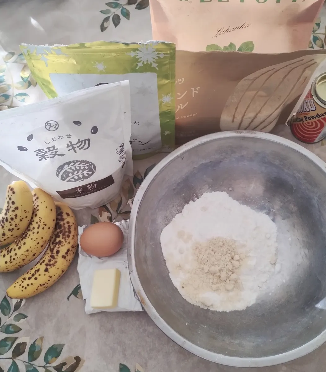 ①ボールにバナナをちぎり入れ潰す 溶かしバター 砂糖を入れ攪拌器で混ぜる