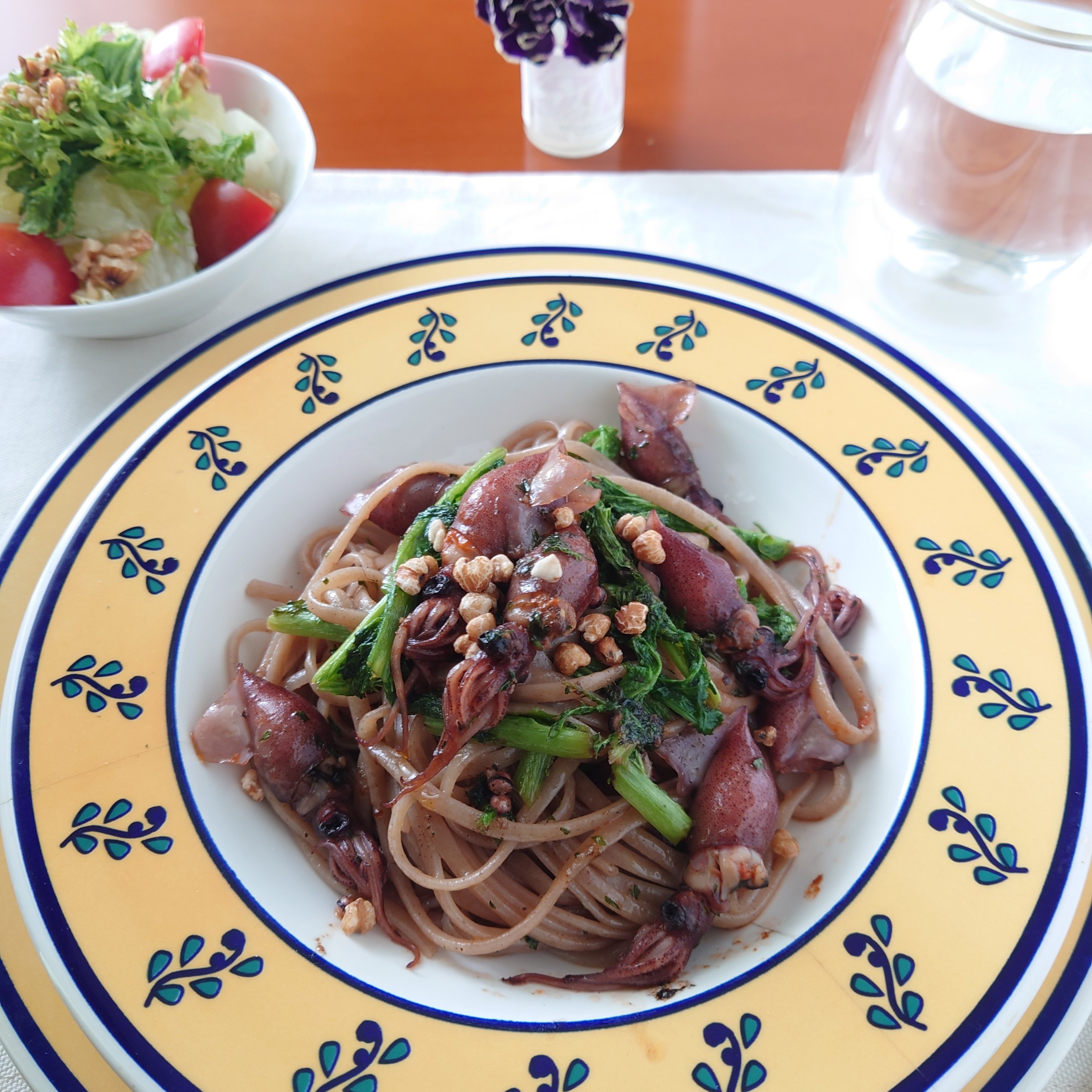 ほたるいかとわさび菜のパスタを作り、べっぴんはとむぎをトッピングしました😋