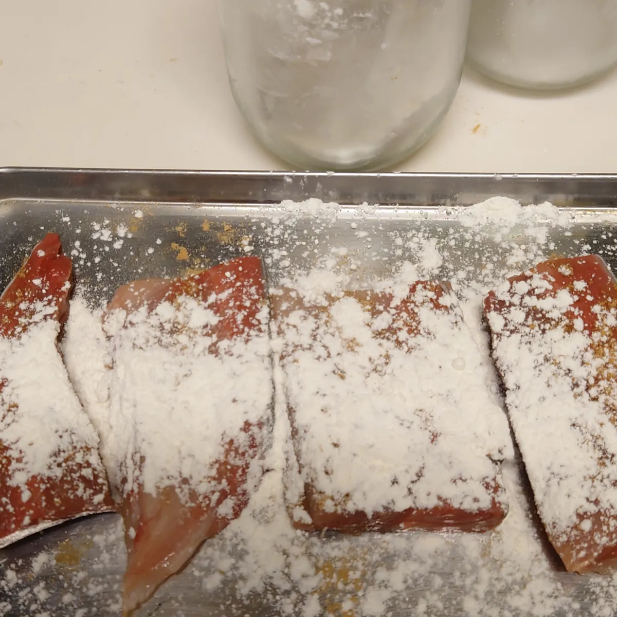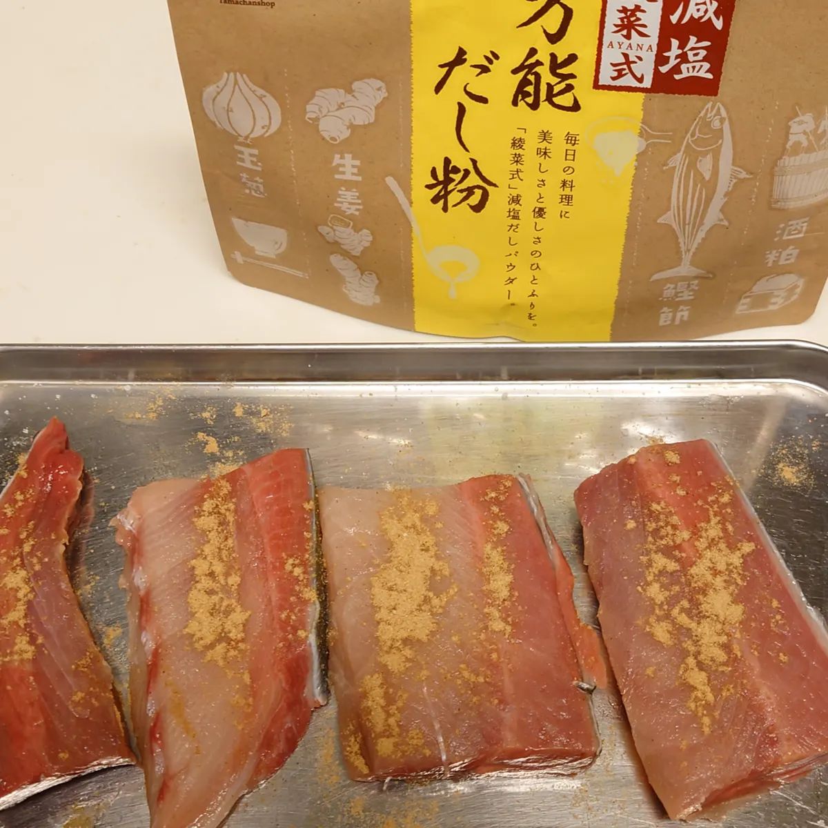 ①トレイにぶりを並べ、万能だし粉を表面にかけ、薄力粉をまぶす。