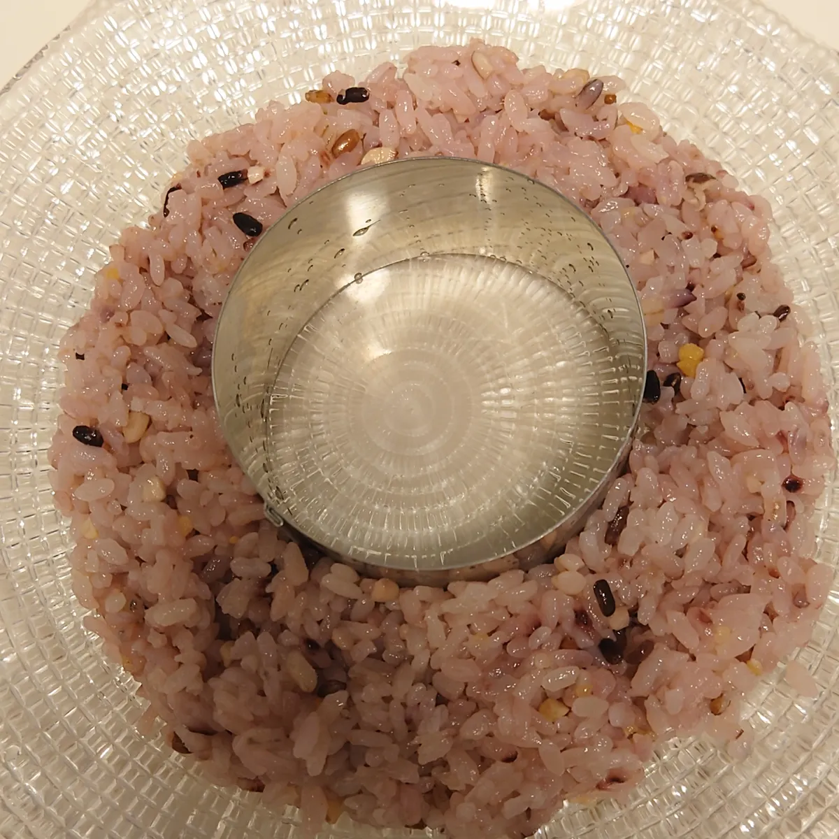 ②お皿の真ん中にセルクルを置き、周りにすし酢1/2を丸く盛り付ける。