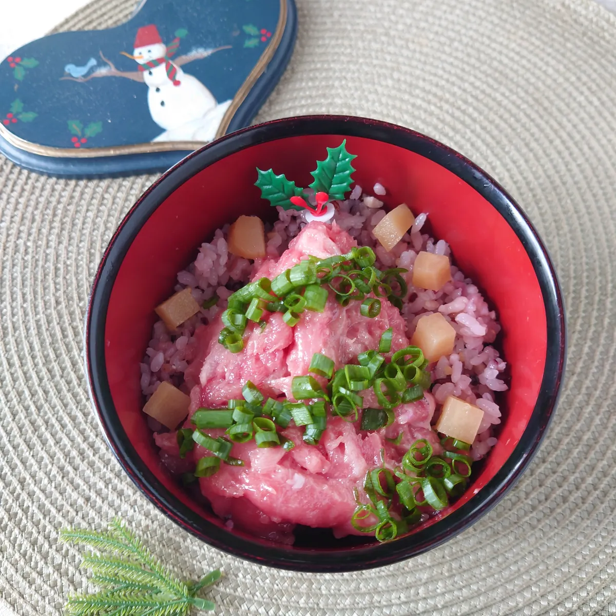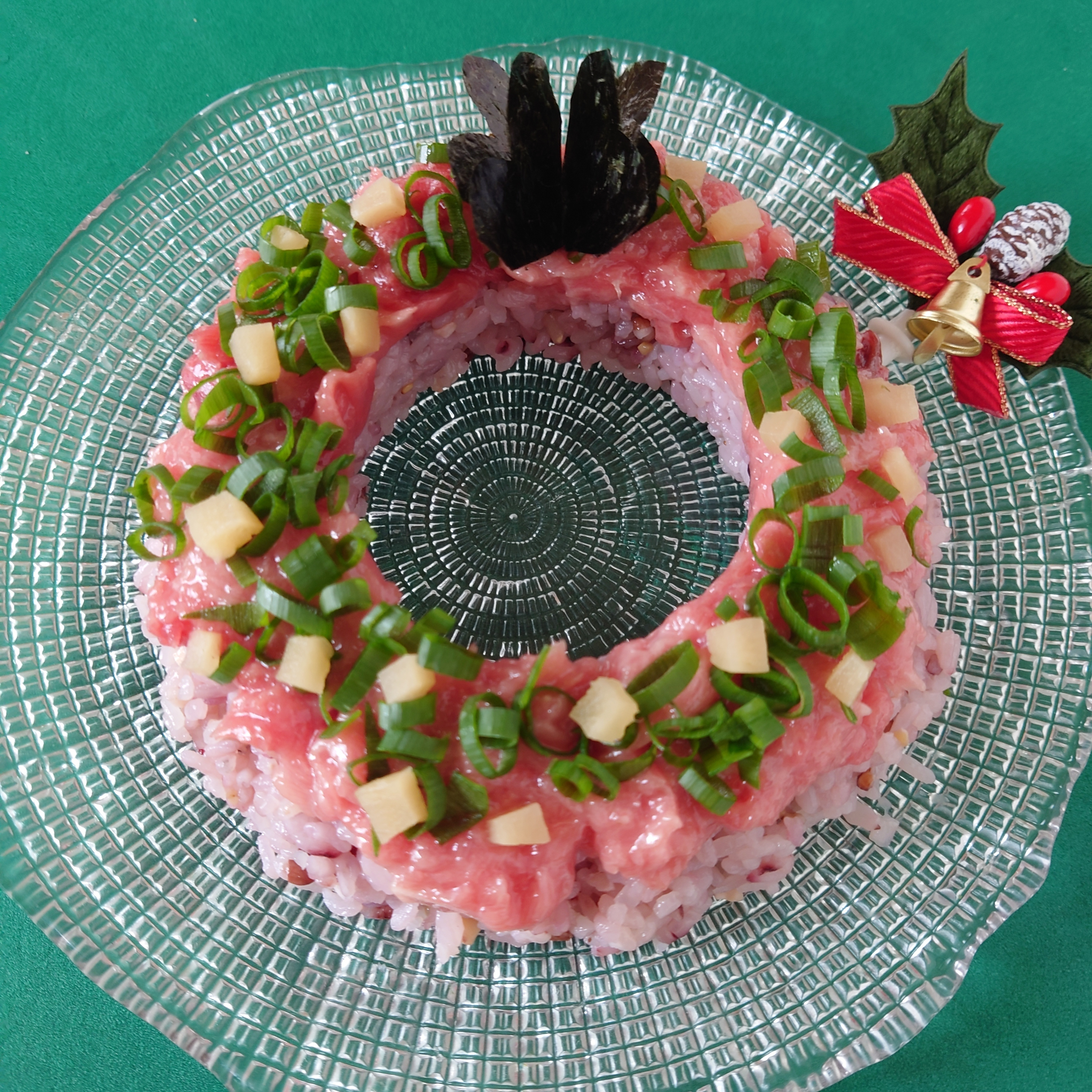 ③スプーンですいたまぐろを全体にのせ、生姜の甘酢づけ、万能ねぎ、リボンに切って重ねた海苔をトッピングして完成です。