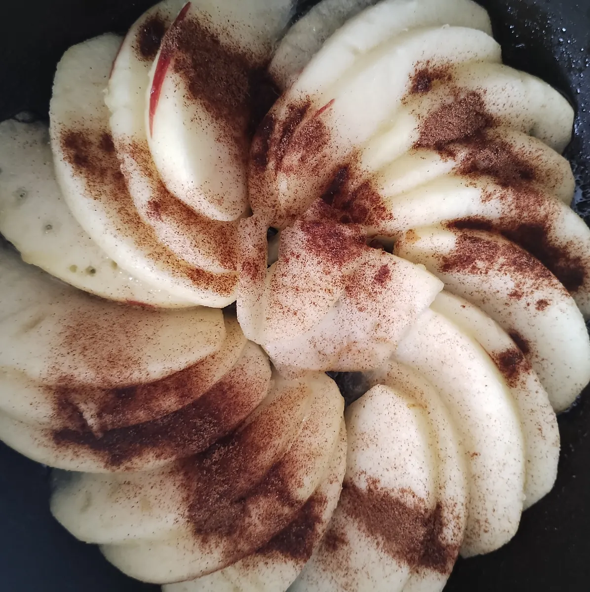 ②フライパンにバター、ラカントを入れ火を付け溶けたら一旦火を止めて スライスりんごを放射状に並べ お好みでCinnamonPowderをふる