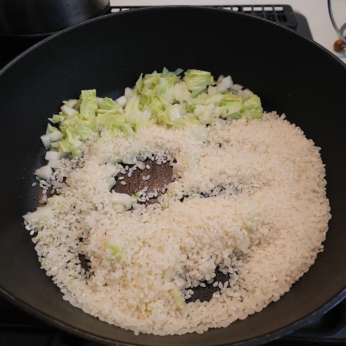 ④おこめを加え透き通るまで炒める。