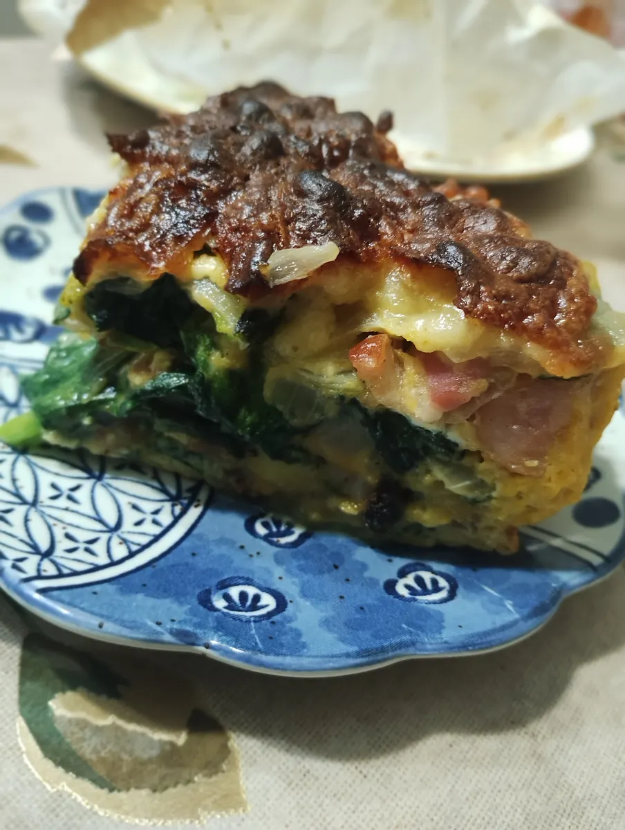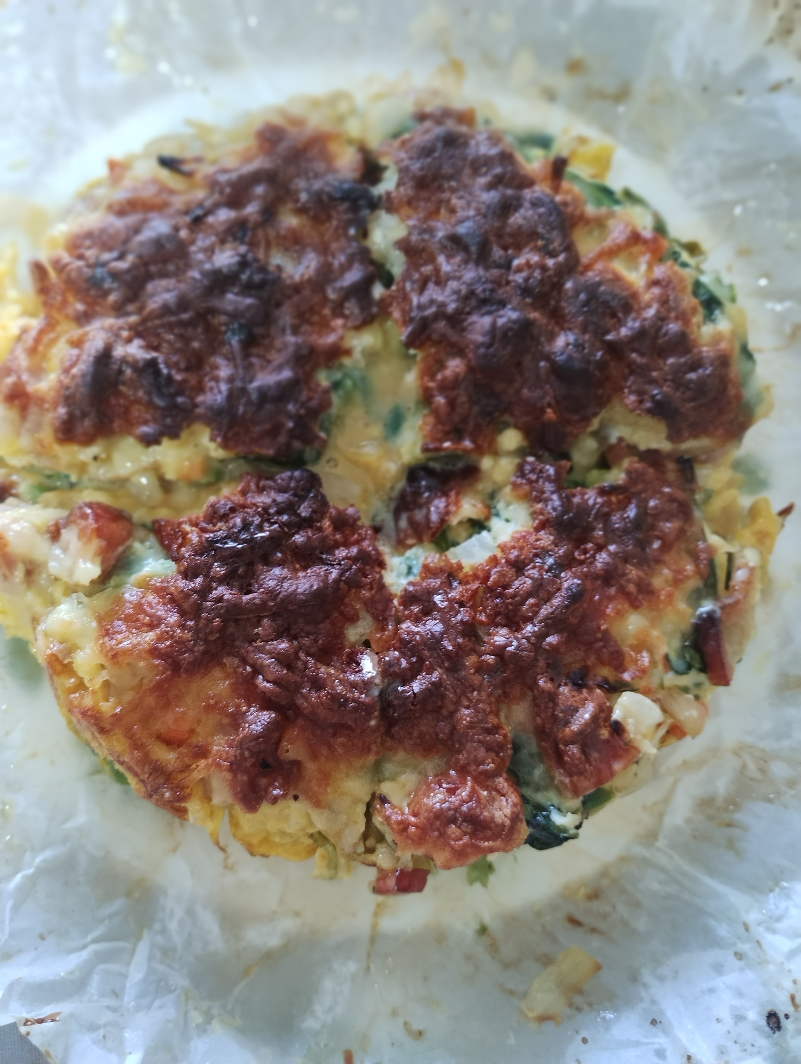 ④直径20cmくらいの鍋にクシャクシャにして伸ばしたクッキングシートを敷いて そこに 炒めた具材と③を交互に3層重ね 最後にシュレッドチーズ半量を全体にまぶし オーブン200℃で30分〜40分焼いて出来上がりです!