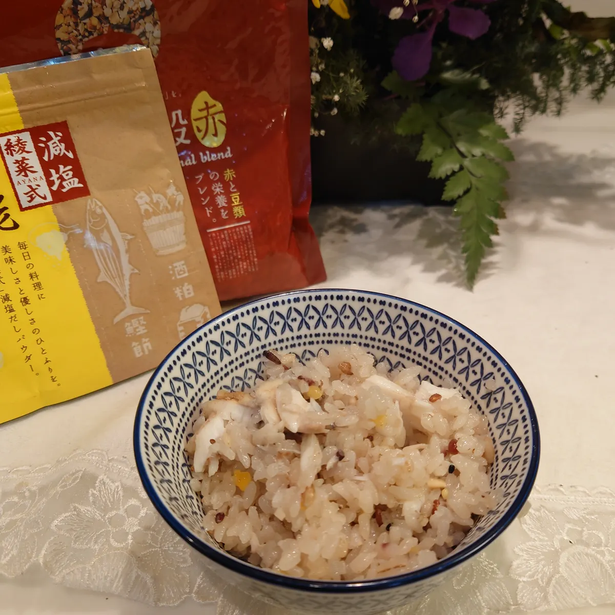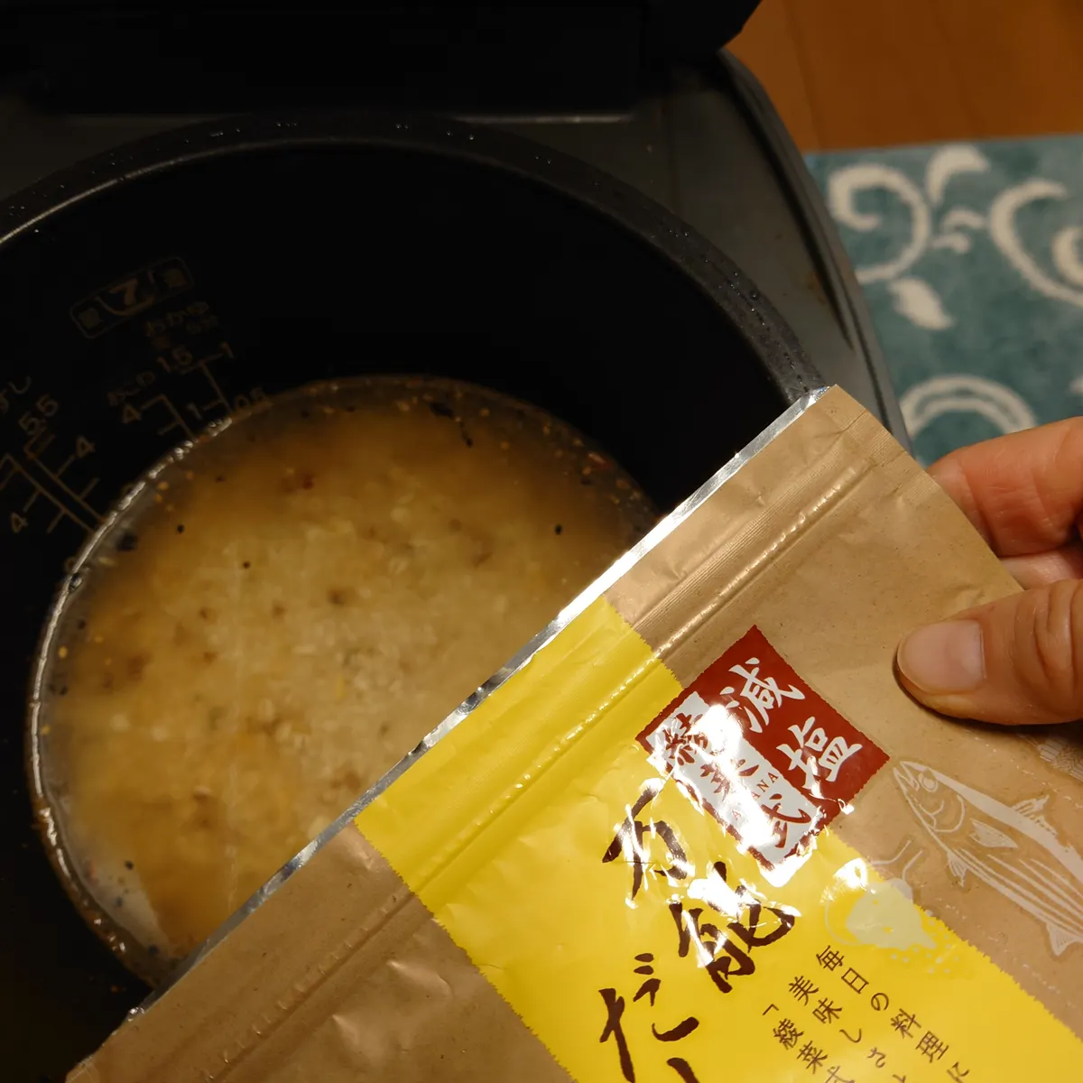 ②米をといで炊飯器に入れ、2合分の水を入れ、大さじ2水を取り出す。白だし大さじ2と万能だし粉を入れよく混ぜ、Aと鯛を入れ炊飯する。