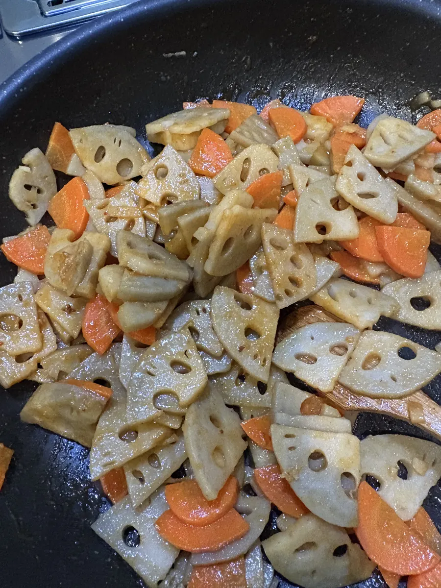 炒めず 蒸すことで 蓮根のモチモチ感がよくなります