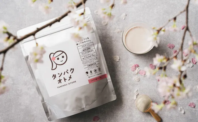 ほんのり色づいた春色プロテインは見た目にも楽しく、たんぱく質のほか美容成分もしっかり配合。