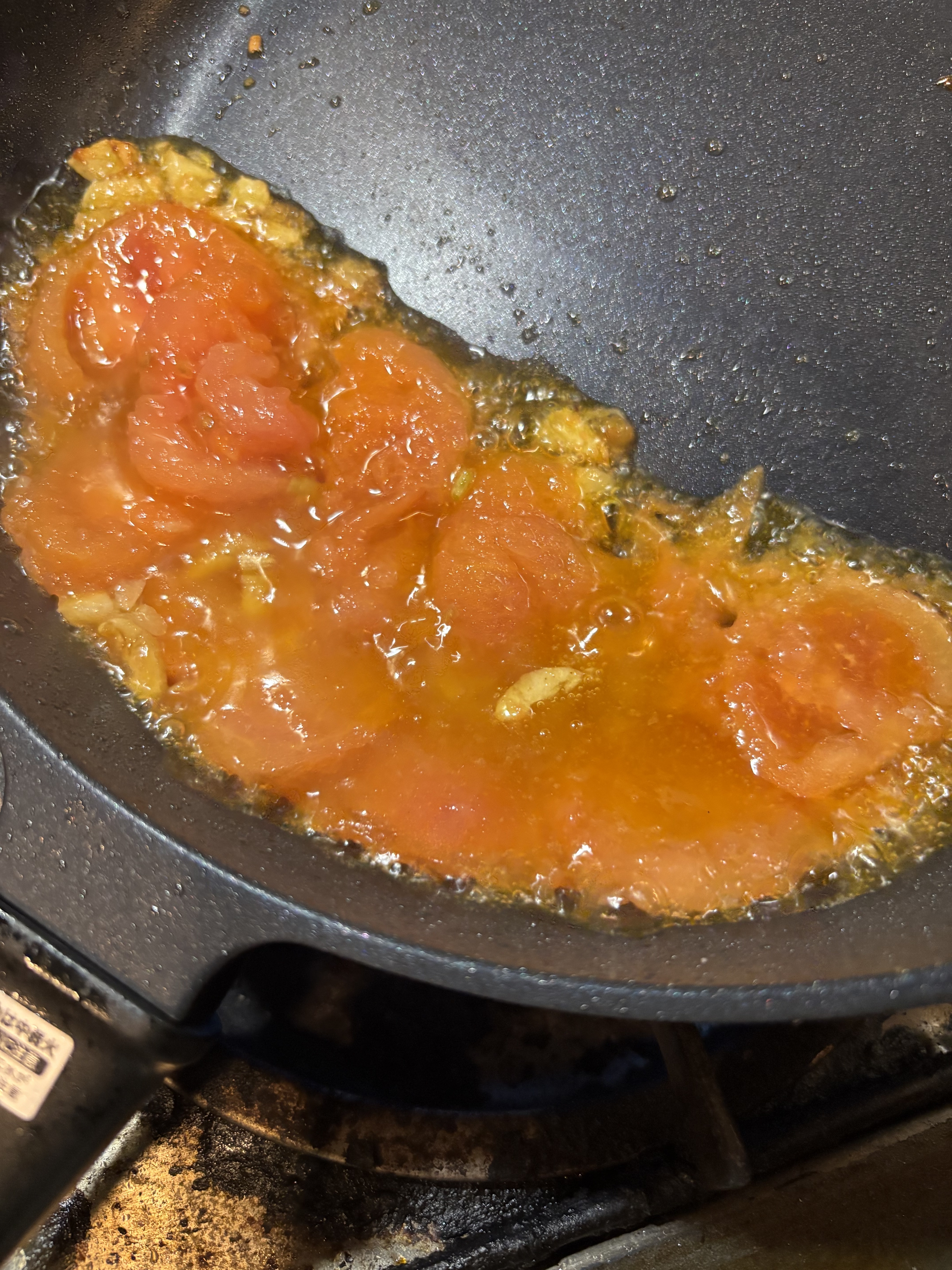 ②ナスを取り出したら、刻んだニンニクを弱火でじっくり火を通して香りを出し、そのオイルにパスタを茹でるために沸かしたお湯で皮を湯むきしたトマトをドボン!🍅