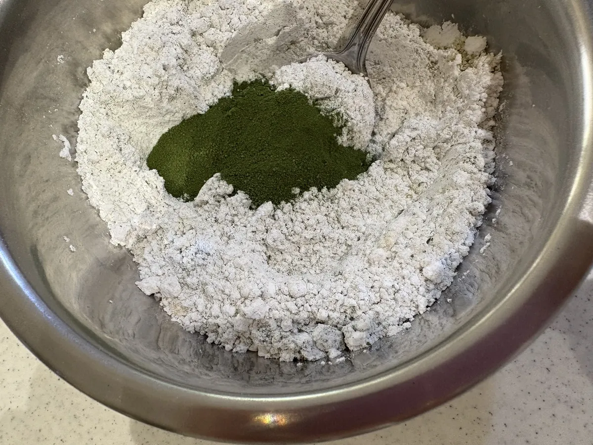 ①米粉、アーモンドプードル、青汁、こなゆきコラーゲン、べーキングパウダーは合わせてふるっておく