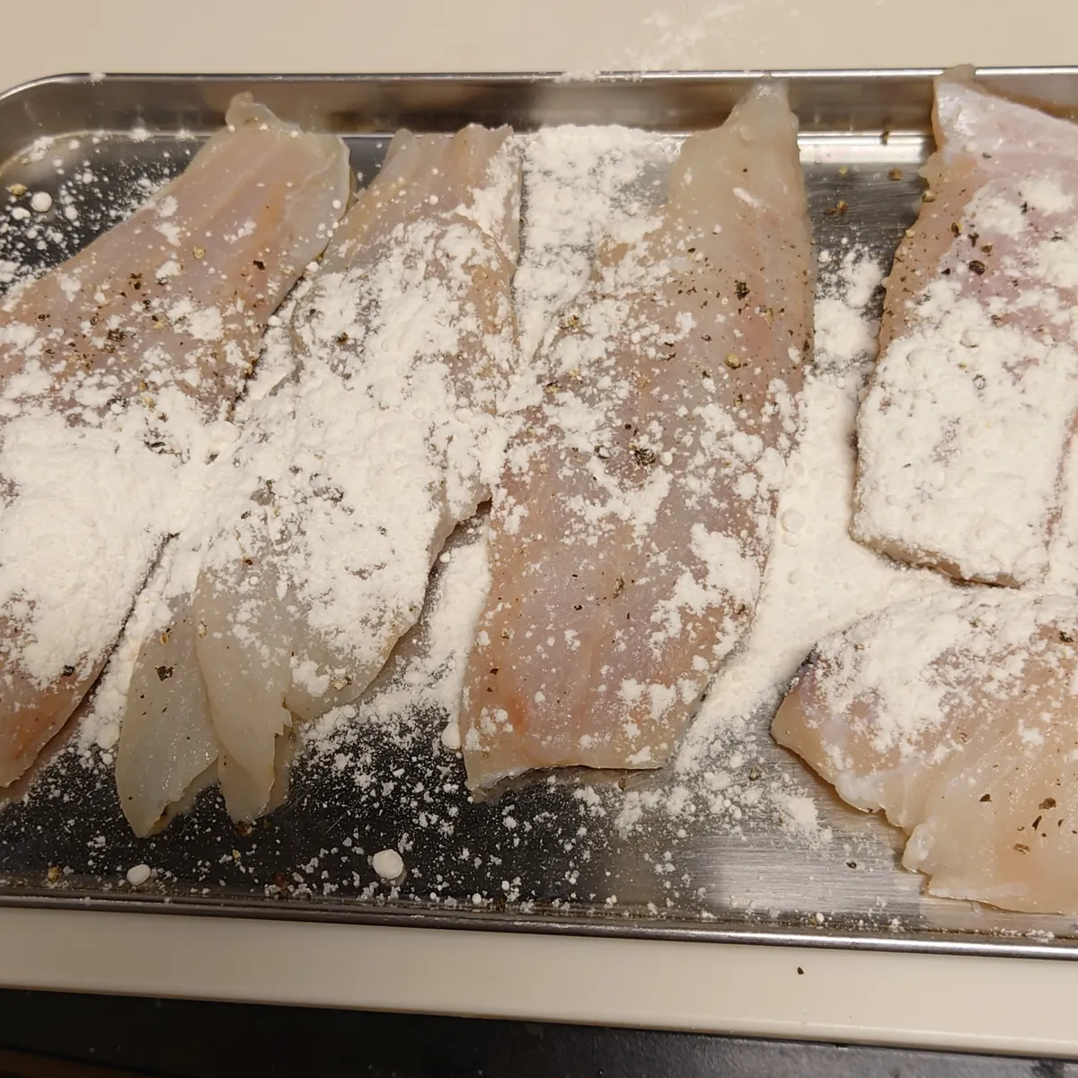 ①生鱈はキッチンペーパーで水気をふいてトレイに並べ薄力粉をまぶす。
