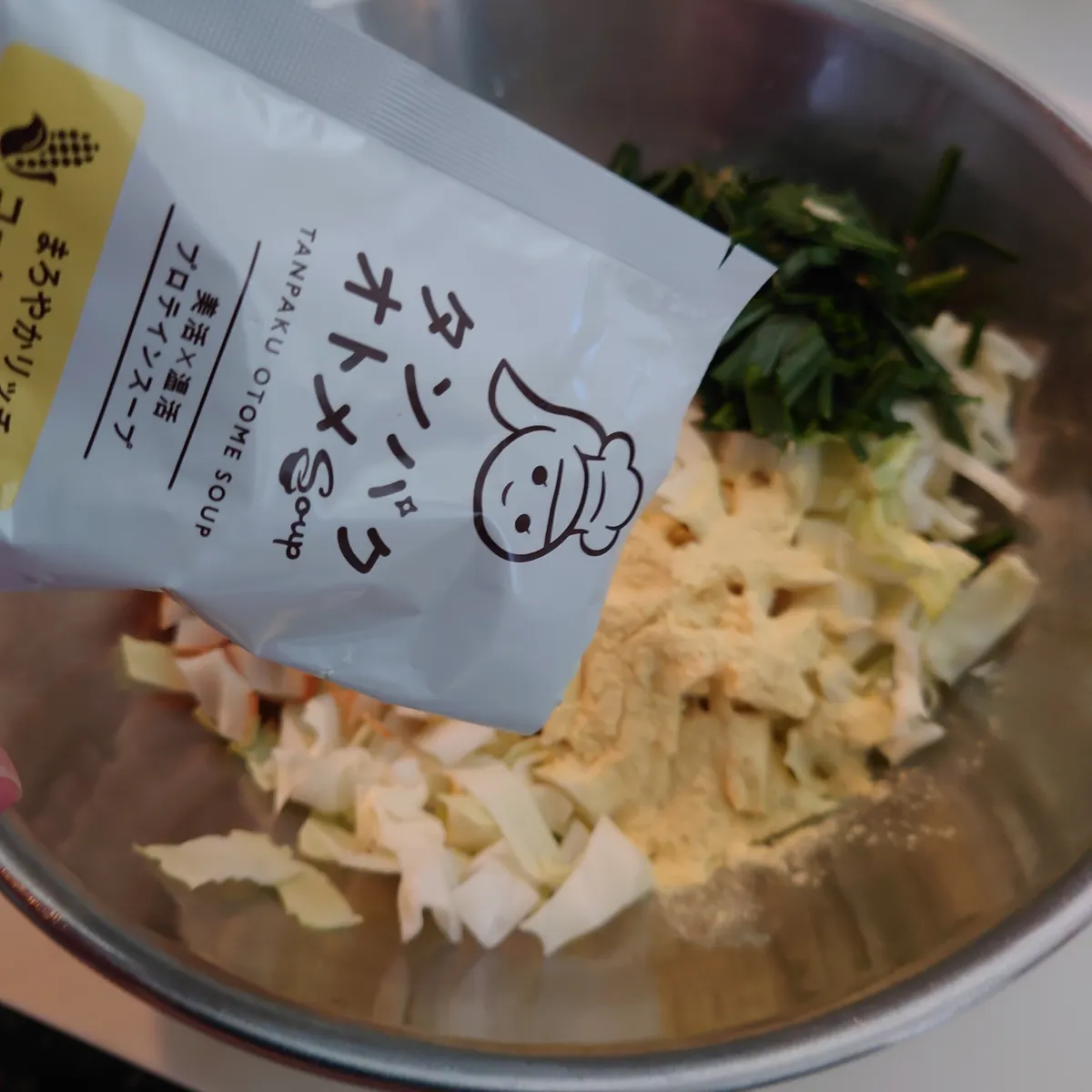 いつもは、鶏ガラスープかだしの素を使うのですが、たまねきスープに変えてタンパクオトメスープを入れてみました😋