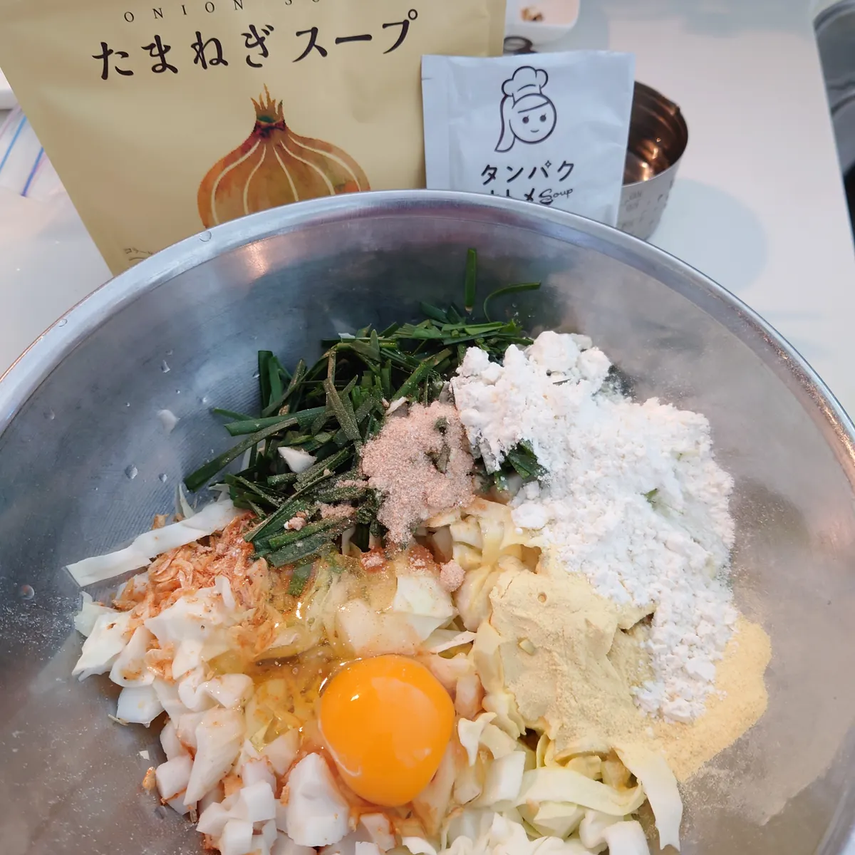たまねぎスープとコーンスープ入りのお好み焼き、旨味たっぷりですね🤤💛