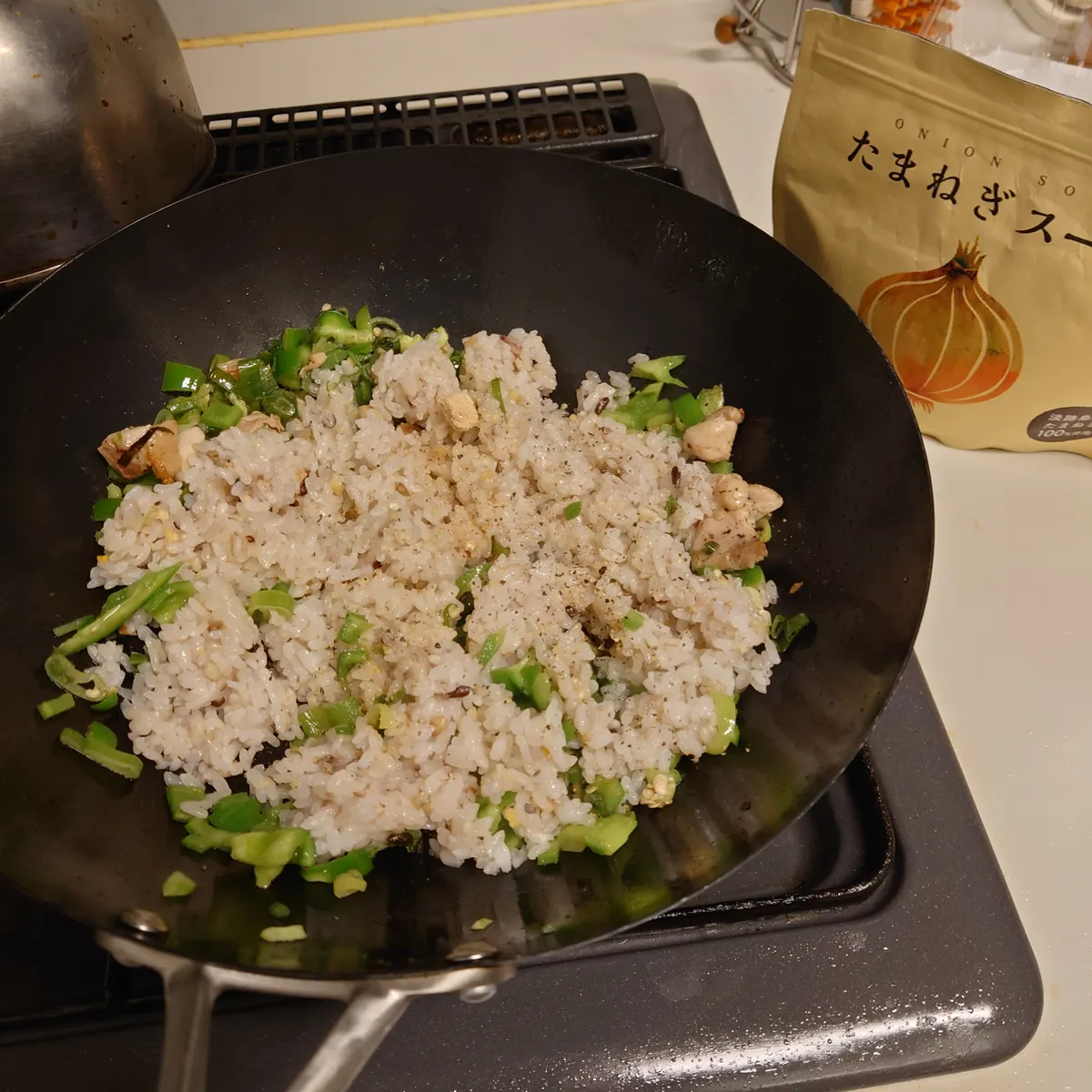 ②フライパンに米油を入れ、鶏肉を皮目から入れる。裏返したらフライパンの半分に寄せてねぎを入れ炒め、たまねぎスープ、黒粒胡椒を削りいれる。