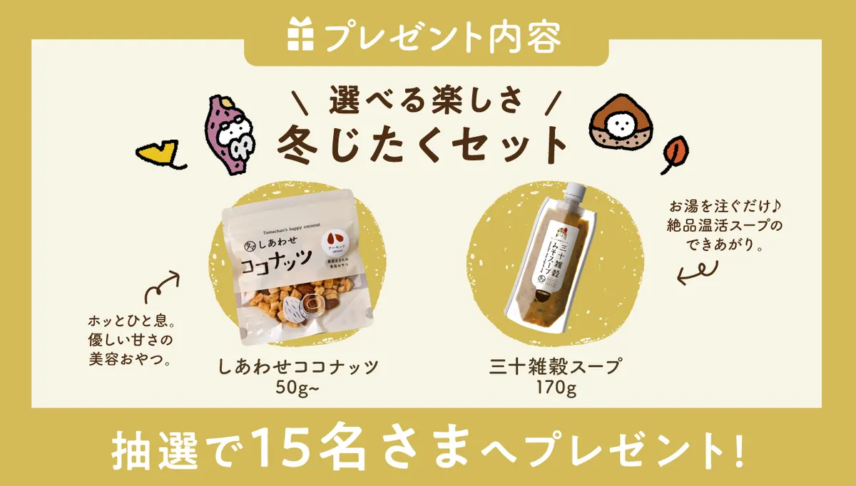 「\選べる楽しさ/冬じたくセット(しあわせココナッツ、三十雑穀スープシリーズ)」をプレゼント✨🎁