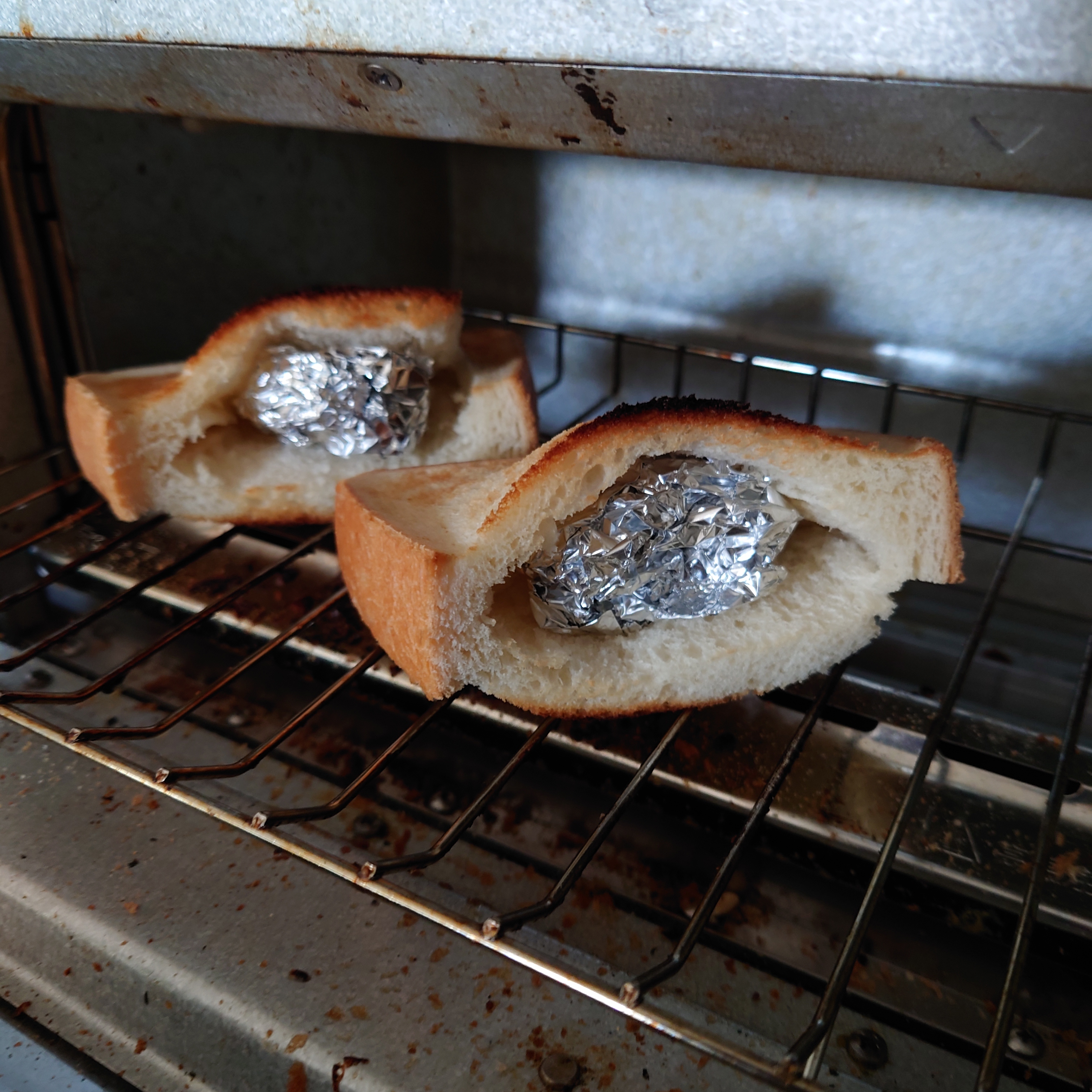 ①食パンを半分に切り真ん中をコの字型に切り込みを入れる。丸めたサンホイルを切り込みに入れてトースターで焼色が付くまで焼く。