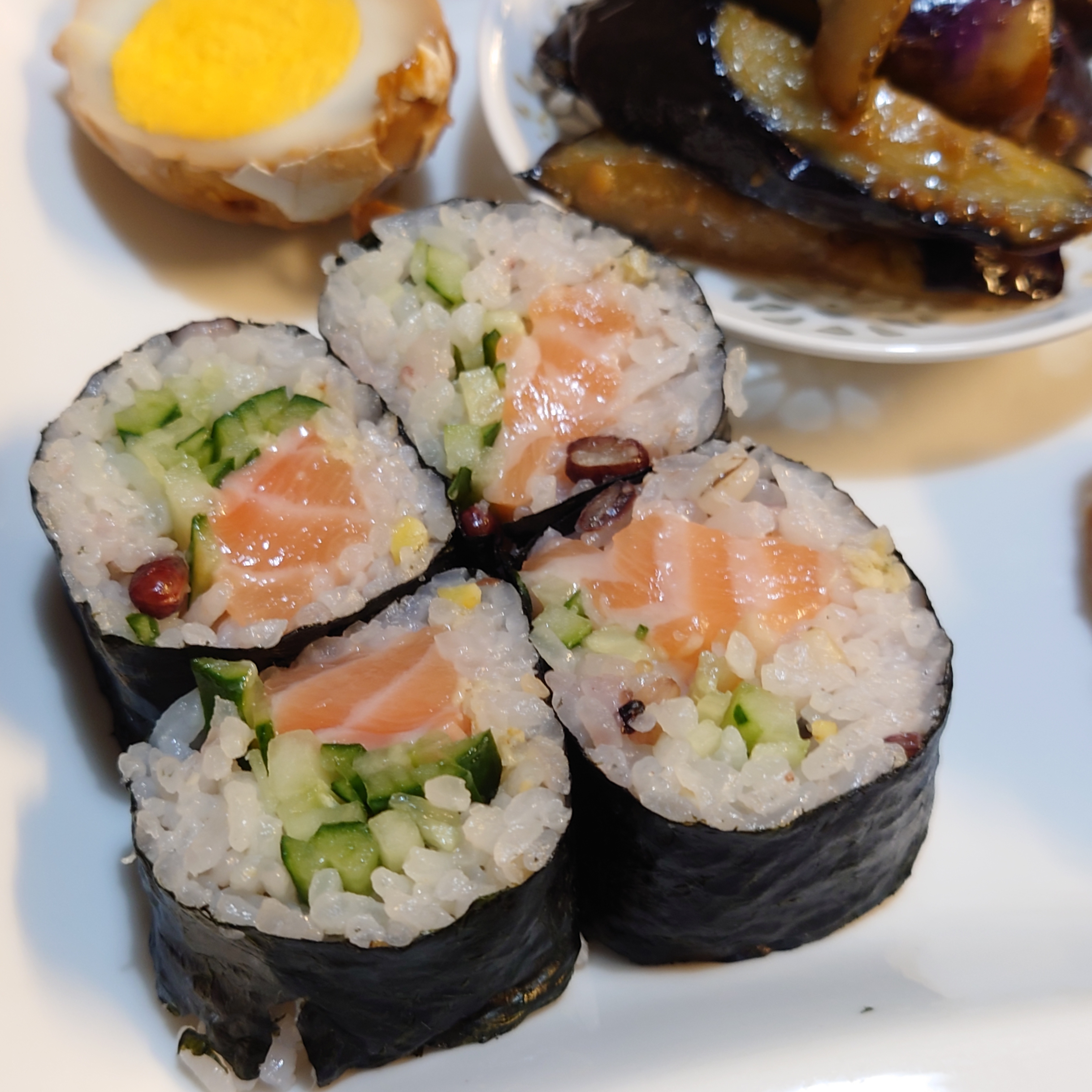 ②巻きすに海苔をおき、酢飯1/2を広げ、サーモンときゅうりを置いてまく。