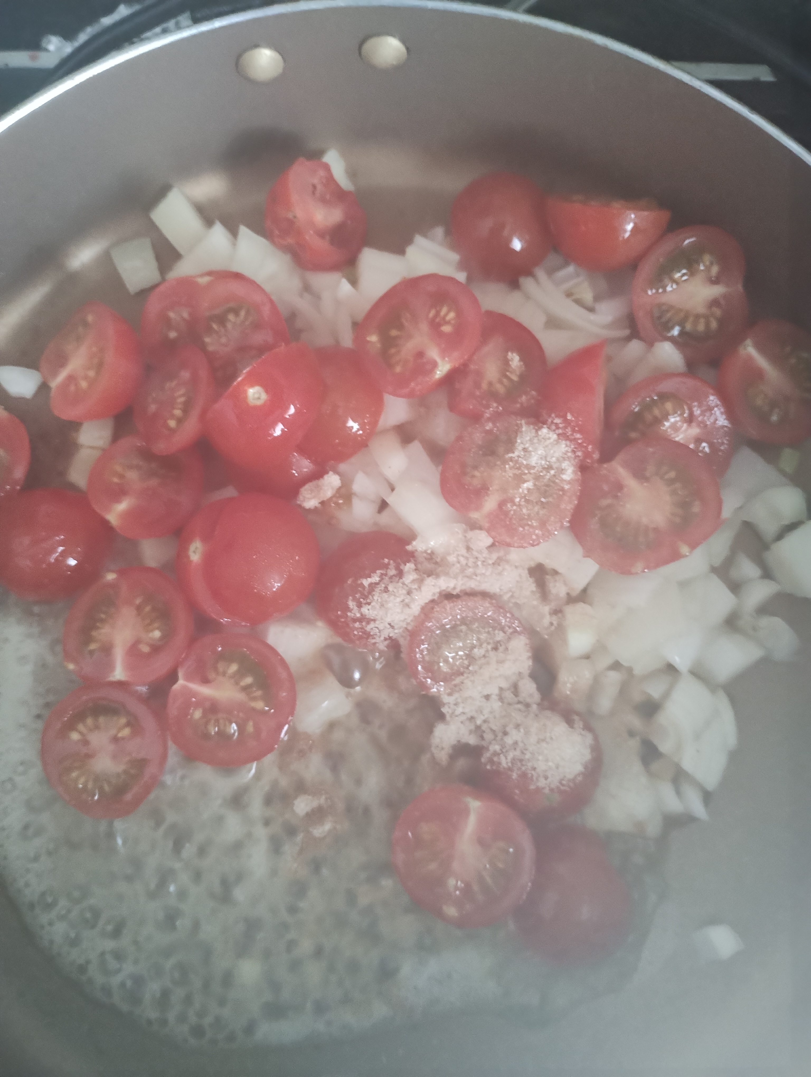 ①フライパンにバターを入れ、玉ねぎみじん切り、ミニトマト、たまねぎスープを入れて炒める