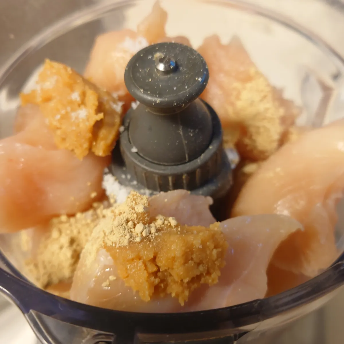 ①鶏肉は、一口大にきって、調味料ごま油までを全部フードプロセッサーに入れて滑らかにする。