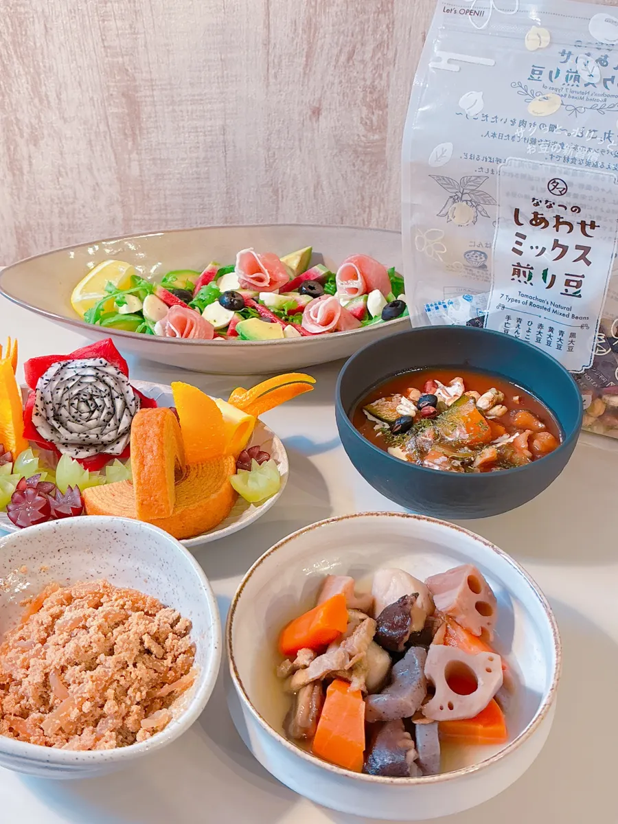 電子レンジのみで完成!超美味しい🍅トマトスープに煎り豆🫘