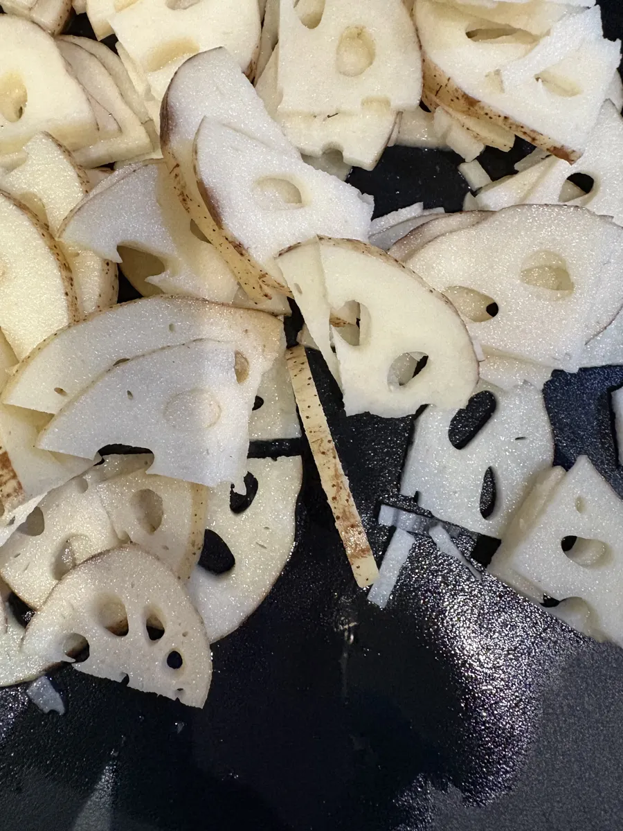 (蓮根は生はマットな白色ですが 火が通ると 透明感のあるグレーよりの白色なります)