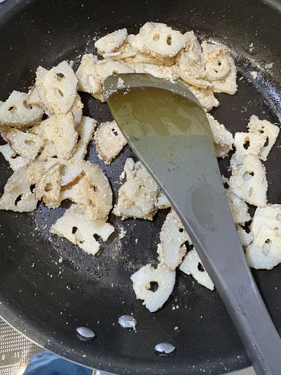 ③フライパンに 太白純正胡麻油を入れ 水気を拭いた蓮根を炒めます