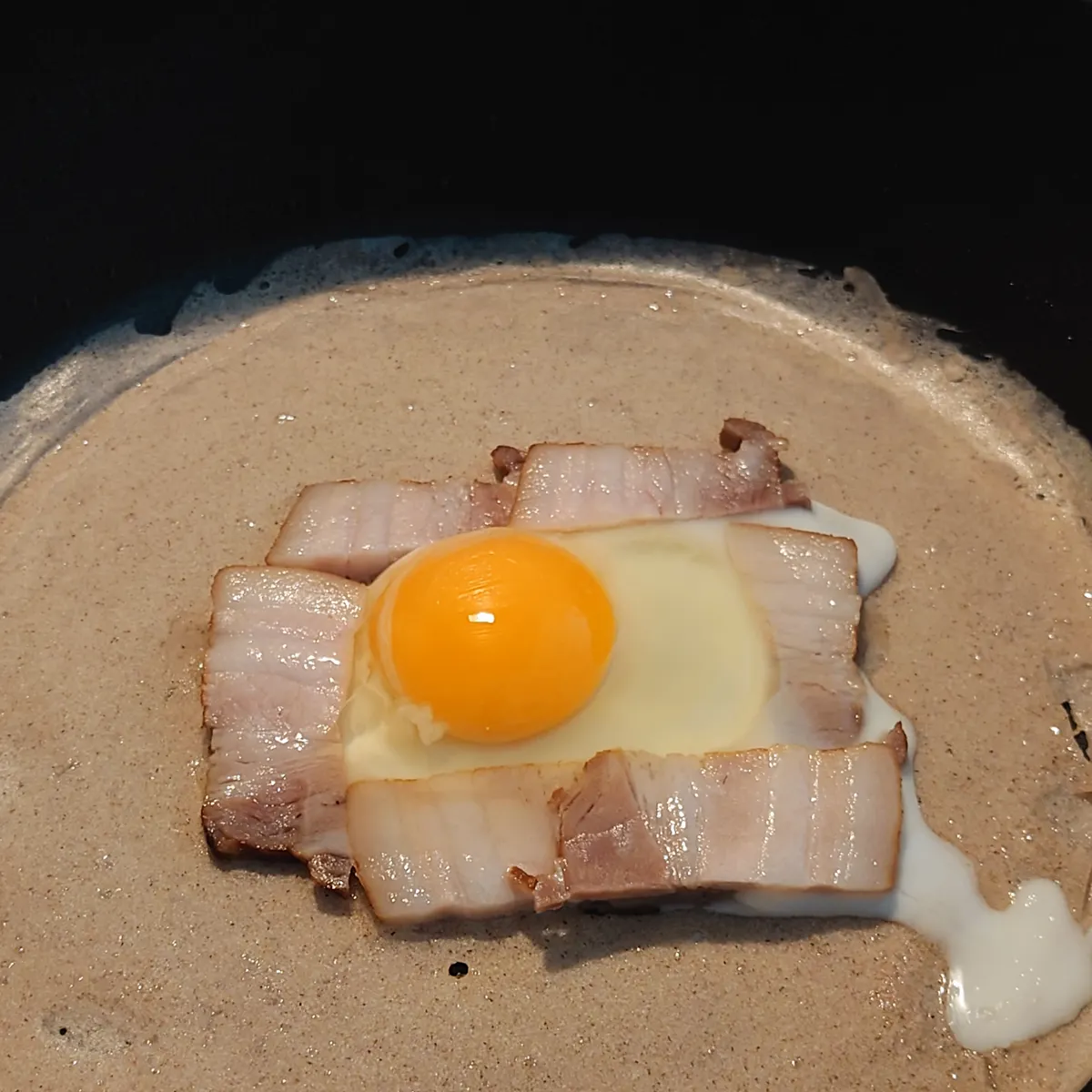 ③表面が乾いてきたら、切ったベーコンで土手を作り真ん中にたまごを落とす。