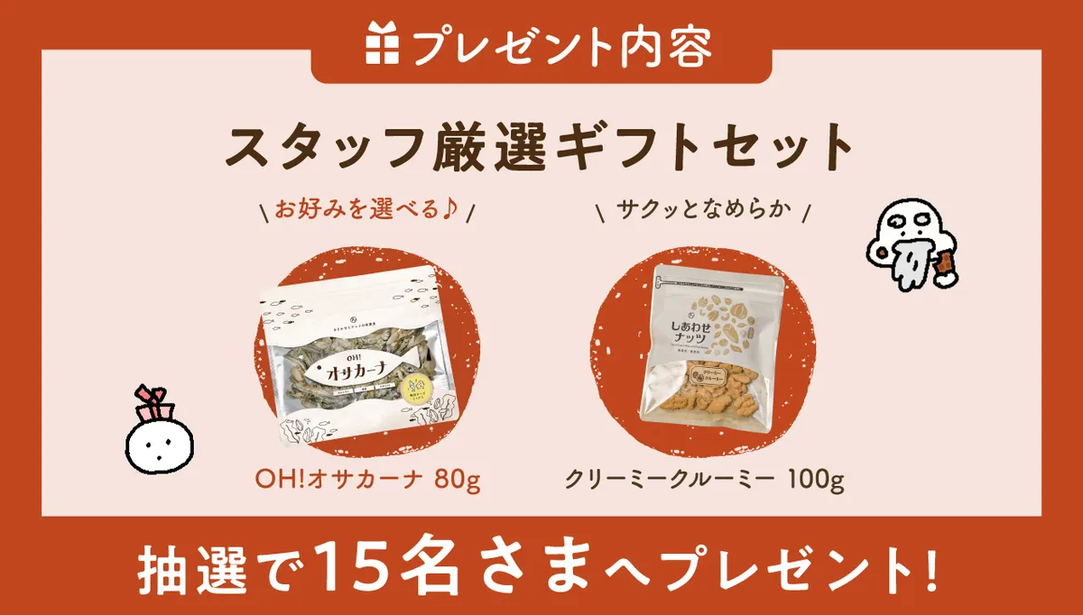 当キャンペーンご参加いただいた方のなかから、抽選で15名さまに「スタッフ厳選ギフトセット」をお贈りいたします🎁