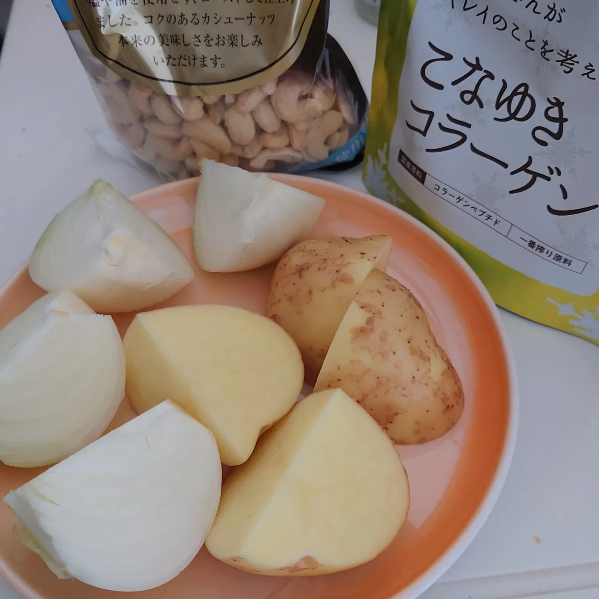 ①じゃがいもとたまねぎは4等分に切り耐熱容器に入れて600wで6分レンチンする。蓋を開けずそのまま1,2分放置。