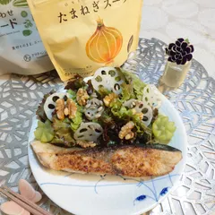 ぶりのソテー ■材料・分量・2人分レシピの味が再現できるよう、材料(食材や調味料)とその分量を書いてください。・ぶりの切り身 2切れ・たまねぎスープ 小さじ1・薄力粉 大さじ1・黒胡椒 適量・太白ごま油 大さじ1・サニーレタス 4枚・シャインマスカット 2個・れんこんの甘酢漬け 12枚・くるみ適量・しあわせシード