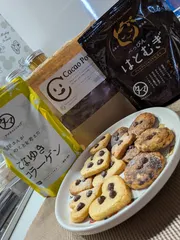 カカオ&チョコチップクッキー お久しぶりの投稿です✍🏻ふとクッキーが作りたくなり、ちょうどタマチャンのお菓子アイテムがあったので活用してみました🍪 ■材料・分量・クッキーミックス 100g・豆乳 大さじ1・べっぴんはとむぎプレミアムショコラ仕立てお好み・カカオパウダー 適量・こなゆきコラーゲン 仕上げに少量
