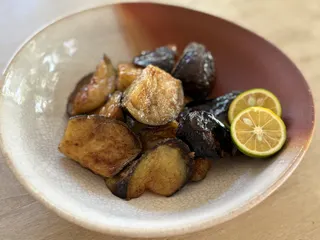 茄子の甘酢炒め 秋といえば 茄子🍆茄子を使って簡単一品万能だし粉も入れてます15分もあれば出来ます今夜の一品にどうぞ❤️ 【 材料 】4人分茄子 中ぐらいサイズを4本米粉 大1太白純正ごま油(お好きな油で) 適量●万能だし粉 小1/2●きび砂糖 小1●みりん 小2●醤油 小1●リン