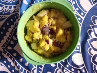 私の幸せご飯 サツマイモが沢山手に入り、ご飯に炊きこんで、おかずは肉じゃがならず肉さつまです。鳥ミンチ薬膳スープとサツマイモの煮込みです。味醂を加えて出来上がり。秋の日の一食に如何ですか?!