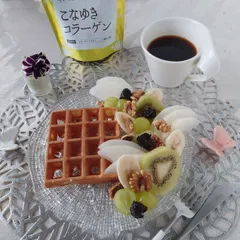 秋のフルーツワッフル ずっと、食べたいと思いながら、重い腰が上がらず、やっと作る事が出来ました😋 ■材料・分量・2人分レシピの味が再現できるよう、材料(食材や調味料)とその分量を書いてください。・薄力粉 100g・こなゆきコラーゲン 小さじ2・ベーキングバター 5g・バター 30g・きび糖 20g・蜂蜜 大さじ