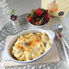 きのこの豆乳グラタン ■材料・分量・2人分レシピの味が再現できるよう、材料(食材や調味料)とその分量を書いてください。・えのき、ぶなしめじ、エリンギ 各1/2袋・マカロニ 1/2袋(約80g)・無調整豆乳 300cc・薄力粉 大さじ2・バター 2切れ(約40g)・たまねぎスープ 小さじ2・粒黒胡椒 適量・ピザ用チーズ 2