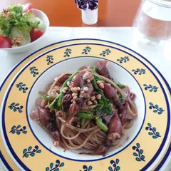 ほたるいかとわさび菜のパスタ✨ ほたるいかとわさび菜のパスタを作り、べっぴんはとむぎをトッピングしました😋 ■材料・分量・1人分レシピの味が再現できるよう、材料(食材や調味料)とその分量を書いてください。・もちむぎ生パスタ 100g・わさび菜 1/2袋(4等分にきる)・ほたるいか 1/2ハック・エキストラヴァージンオリー