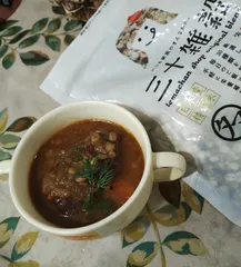 ■材料・分量3人分・三十雑穀白 大3・牛すじ肉 3枚・玉ねぎ 1個・人参 1/2本・ブラウンマッシュルーム 7〜8個・三十雑穀完熟トマトスープ 大さじ2・たまねぎスープ 大さじ1と1/2・酒 大さじ2・ウスターソース・粉黒糖 大さじ1・バター 10g・水 500cc
