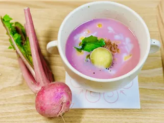 🌿簡単✨秋野菜のポタージュスープ 秋野菜の栄養たくさん丸ごといただけるスープです🥣優しい野菜の甘さがホッとします簡単ですので朝食にパンとどうぞ🍞🔶材料🔶(2人分)・たまねぎ中位 半分・赤大根 100g・カブ 100g・じゃがいも150g &nb