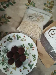 生チョコトリュフ ■材料・分量☺️生チョコタルトの余りを使用したので 分量はトリュフと足した分量なのでご了承下さいませ🙏🏻・LOTTEのブラック板チョコ 5枚・生クリーム 150ml・カシューナッツ お好きな量・カカオパウダー 適量・ラム酒 大さじ1 無くても🆗■作り方①ボールに板チョコを地道に割り入れる